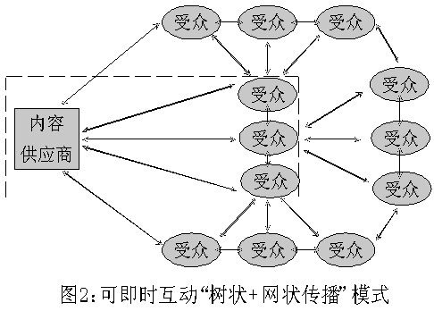 從傳播學(xué)角度分析,傳統(tǒng)媒體傳播方式是“樹狀傳播”,是點(diǎn)對面的單向傳播,即從一個信息源(樹根)向受眾(樹葉)作單向傳播(見圖1)。受眾(樹葉)向信息源(樹根)的反饋,是滯后的、非同介質(zhì)的(讀者來信、來電等),傳播和反饋不能同步進(jìn)行。而新媒體的傳播方式則是“網(wǎng)狀傳播”,即它是一個漁網(wǎng)式的傳播網(wǎng),網(wǎng)上的任意一個節(jié)點(diǎn),都可以向其他任意一個節(jié)點(diǎn)或節(jié)點(diǎn)群作點(diǎn)對點(diǎn)、點(diǎn)對面的單向或雙向互動式傳播,傳播者和受眾之間可以即時互動,信息反饋可以即時進(jìn)行,傳和受的位置可以即時互喚。