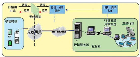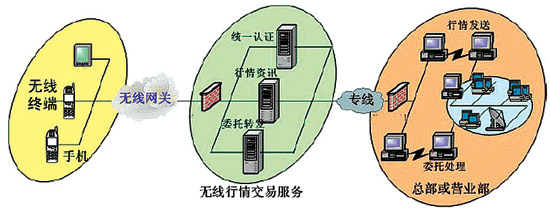 從技術上說,“移動交易廳”主要采用WAP及專用手機客戶端方式,客戶可以通過訪問證券公司專門申請的域名(如廣發(fā)證券公司的http://wap.gf.com.cn),鏈接到證券公司的WAP手機炒股系統(tǒng)服務器,下載手機客戶端軟件,然后通過無線接入網(wǎng)關登錄到移動證券業(yè)務平臺。移動證券業(yè)務平臺的行情及委托交易系統(tǒng)完全利用現(xiàn)有的網(wǎng)上交易系統(tǒng)的資源。
