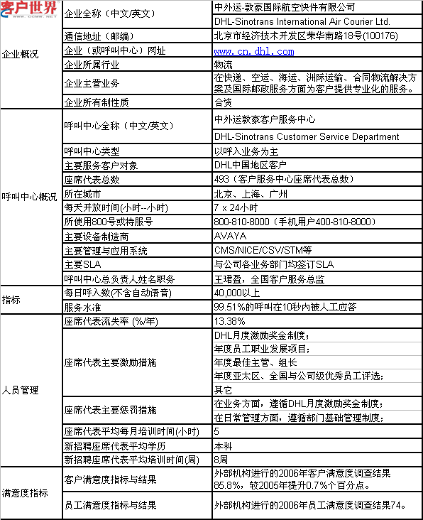 中外運敦豪客戶服務中心一直在逐步建立信息反饋機制和質量管理體系,從而確保服務不斷提升,實現和衡量客戶滿意效果。提供的服務有如下幾個特色:多渠道,通過多媒體客戶互動方式,讓客戶隨時隨地與客戶服務中心暢通聯系;一站式,通過客戶首次致電解決率和質量監(jiān)控,確保真正達到一站式服務;全天候,全年365天的不間斷熱線服務,確保每次聯絡都可以迅速理解客戶的需求,提供準確、詳盡的信息和解決方案;個性化,通過主動查詢、專人服務、快件保險等增值服務,讓全球客戶享受個性化解決方案;高績效,擁有經驗豐富的管理團隊,應用標準規(guī)劃客戶服務中心發(fā)展方向和遠景,并通過流程控制、業(yè)務監(jiān)控等方式合理安排工作時間和人員配備,完成和保持DHL亞太區(qū)2003-2006年度的各項績效指標的領先地位;滿意度,為了確保在每一次聯絡中讓客戶滿意,經過外部專業(yè)咨詢公司的年度客戶滿意度調查結果,中外運敦豪的客戶服務滿意度在物流業(yè)位居首位,公司還每兩年組織一次員工滿意度調查,并通過行動,吸引優(yōu)秀人才繼續(xù)和公司共同發(fā)展。