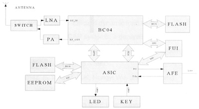 其中,BC04支持最大4個(gè)活動(dòng)連接(包括耳機(jī)),同時(shí)支持兩路SCO語(yǔ)音,所以語(yǔ)音通過(guò)PCM和ASIC PCM相接可以有多路被送到模擬端,從而實(shí)現(xiàn)3方通話(huà)。ASIC部分實(shí)現(xiàn)PCM語(yǔ)音數(shù)據(jù)與模擬語(yǔ)音信號(hào)的相互轉(zhuǎn)換,通過(guò)發(fā)送和接收PSTN信令,負(fù)責(zé)對(duì)人機(jī)界面的控制。它通過(guò)GPIO(General