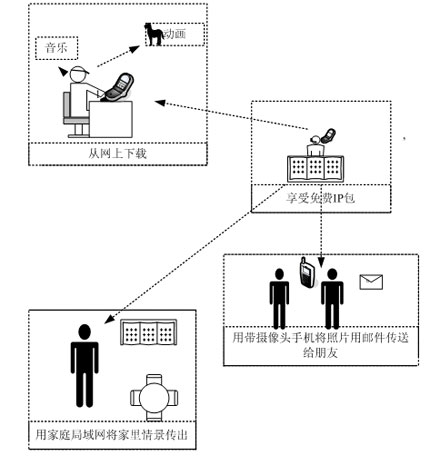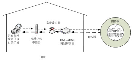DoCoMo公司網里現(xiàn)有這類手機共37種),通過無線方式與免費IP包傳輸中繼器相連,免費IP包傳輸中繼器通過以太網經過寬帶路由器或通過PPPoE(Point