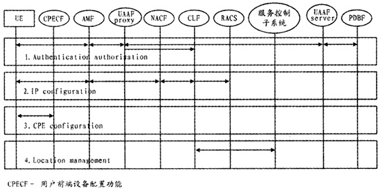 AMF負責翻譯UE的接入請求,將UE的IP地址分配請求以及網絡配置參數請求轉發(fā)至NACF,將用戶鑒權請求轉發(fā)給用戶接入鑒權功能(UAAF),反向則將來自NACF或UAAF的響應轉發(fā)給UE。