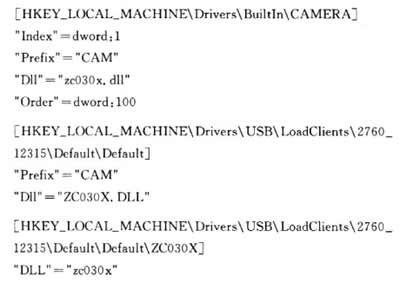 系統(tǒng)自動加載驅動程序時,首先要將驅動程序復制到\WINDOWS文件夾下,然后向注冊表中寫入攝像頭的驅動信息:
