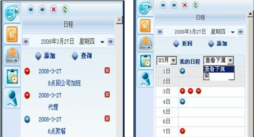 我們用過OUTLOOK的電子日程和手機(jī)自帶的日程功能都知道,電腦本機(jī)和手機(jī)實(shí)現(xiàn)日程管理都又各自很大的局限性,優(yōu)你客巧妙的實(shí)現(xiàn)了日程的網(wǎng)絡(luò)化管理并可以捆綁在手機(jī)提醒上,獨(dú)特又實(shí)用。其中紅綠日程各自代表工作和個(gè)人事務(wù),其中工作日程還能共享給上級(jí)。
