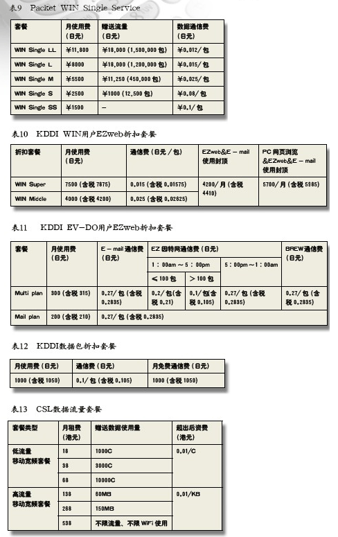 用戶使用WIN au手機(jī),通信包標(biāo)準(zhǔn)計(jì)費(fèi)為0.1日元/包(Packet)(含稅0.105日元),其中1Packe=128Bytes。KDDI為用戶提供分檔包月套餐,見(jiàn)表9。