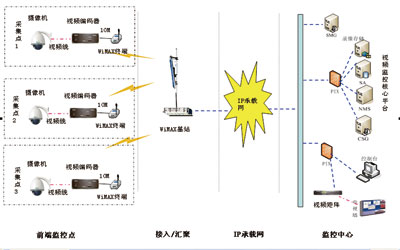 視頻監(jiān)控點分布在城市的各個角落,同時城市建設規(guī)范性要求施工減少對道路路面造成的破壞,在建設過程中,部分地區(qū)無法實現(xiàn)光纜的埋地鋪設,必然會遇到“最后一公里”的接入難題,采用無線技術(shù)進行視頻監(jiān)控信號的傳輸就成為一種很好的選擇。WiMAX系統(tǒng)的無線傳輸特性,可以保證視頻流的傳輸質(zhì)量,同時使監(jiān)控系統(tǒng)在接入層的部署更為快速、簡便。