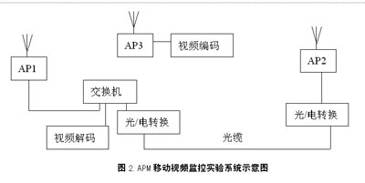 為了保證APM移動(dòng)視頻監(jiān)控系統(tǒng)的整體性能,筆者就APM系統(tǒng)無線網(wǎng)絡(luò)和視頻編碼器的各自性能,進(jìn)行了實(shí)驗(yàn)。本次實(shí)驗(yàn)采用兩個(gè)步驟,即實(shí)驗(yàn)室測(cè)試和現(xiàn)場(chǎng)模擬實(shí)驗(yàn)測(cè)試,并在實(shí)驗(yàn)室測(cè)試的基礎(chǔ)上,對(duì)無線網(wǎng)絡(luò)和視頻編碼器間的初步配合進(jìn)行現(xiàn)場(chǎng)實(shí)驗(yàn)測(cè)試,F(xiàn)場(chǎng)的實(shí)驗(yàn)系統(tǒng)組成如圖2所示。