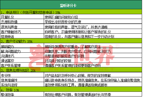 b.一個不可忽視的工作是對表中的各項(xiàng)進(jìn)行嚴(yán)格定義,然后訓(xùn)導(dǎo)師與主管、培訓(xùn)、質(zhì)檢師根據(jù)共同的錄音資料反復(fù)“核對筆記”,取得共識,并將樣本打分結(jié)果發(fā)給座席代表溫習(xí)。