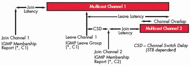 TV節(jié)目通常采用組播方式進行傳送。組播是一種允許一個或多個發(fā)送者(組播源)一次同時發(fā)送單一的數(shù)據(jù)包到多個接收者的網(wǎng)絡(luò)技術(shù)。組播源把數(shù)據(jù)包發(fā)送到特定組播組,而只有屬于該組播組的地址才能接收到數(shù)據(jù)包。在IPTV里,組播源往往僅有一個,即使用戶數(shù)量成倍增長,主干帶寬也不需隨之增加,因為無論有多少個目標(biāo)地址,在整個網(wǎng)絡(luò)的任何一條主干鏈路上只傳送單一視頻流,即所謂“一次發(fā)送,組內(nèi)廣播”。組播提高了數(shù)據(jù)傳送效率,減少了主干網(wǎng)出現(xiàn)擁塞的可能性。對于TV系統(tǒng)而言,其所能夠支持的用戶數(shù)目僅僅受到接入網(wǎng)絡(luò)能力的限制,與前端推送系統(tǒng)的推送能力無關(guān)。因此,TV業(yè)務(wù)性能的主要測試指標(biāo)包括所推送的最大頻道數(shù)目、頻道平均帶寬、平均頻道切換時間、I幀加入延時、平均頻道離開延時、平均頻道加入延時、頻道重疊時間和頻道間隔時間。