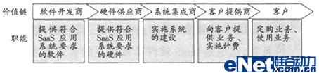 在傳統(tǒng)的軟件開發(fā)模式下,客戶建設(shè)IT系統(tǒng)需要直接面對軟件開發(fā)商、硬件提供商、集成商和售后技術(shù)支持,系統(tǒng)建設(shè)周期長、初期投入大。在SaaS模式下,客戶只需要與服務(wù)提供商發(fā)生關(guān)聯(lián),在向服務(wù)提供商定購業(yè)務(wù)后,客戶無需關(guān)注系統(tǒng)的軟件和硬件,可以直接使用業(yè)務(wù)。從客戶角度,從傳統(tǒng)模式發(fā)展到SaaS模式,價值鏈由并行轉(zhuǎn)變?yōu)榇小腁SP模式發(fā)展到SaaS模式,則出現(xiàn)了新的價值鏈角色服務(wù)提供商。SaaS模式下價值鏈的組成如圖3所示。