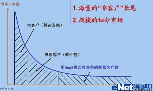 SaaS模式就是不論是什么樣的客戶都向其提供服務(wù),不論服務(wù)的時間長短,不論身處何地。傳統(tǒng)軟件是很難適應(yīng)普通客戶的,普通客戶付不出更多的投資,也不想軟件、硬件、服務(wù)都全面去投資,這樣就只有放棄使用軟件了。自然,軟件市場就少了一大群消費(fèi)者。而SaaS模式將不細(xì)分客戶類型,讓人人都可使用軟件,讓個個都消費(fèi)得起軟件?上攵@是一個怎么龐大的市場。如下圖所示:
