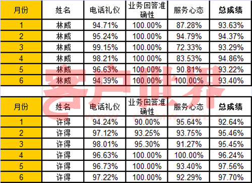 上面這兩張表格,是兩位員工的質(zhì)檢分?jǐn)?shù),從今年一月份開始,一月到六月每個月的質(zhì)檢分?jǐn)?shù),你看到有總分,還有三個分項的成績。請問,林威是新員工,還是許得是新員工?我們下一期公布答案。