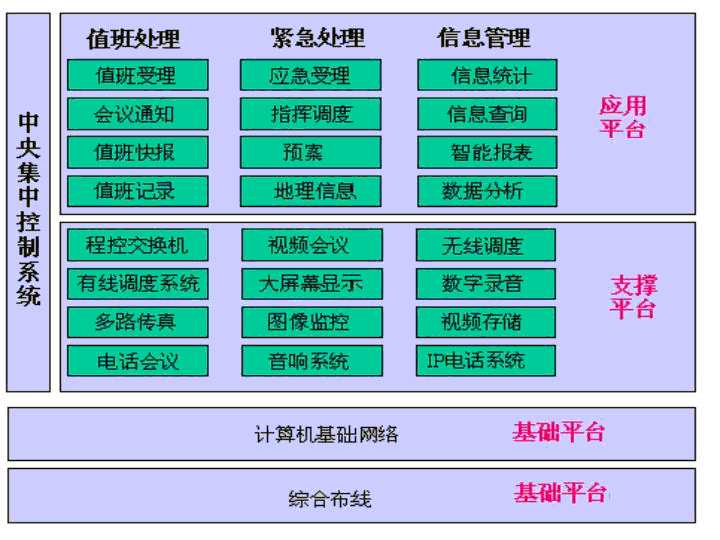 首信應急指揮系統(tǒng)由指揮調(diào)度、監(jiān)控、信息綜合系統(tǒng)和基礎設施保障系統(tǒng)組成,具有指揮調(diào)度、監(jiān)控和信息綜合等功能。