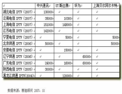 在IPTV設備供應商中,各家廠商各有千秋,其中在國內(nèi)市場占有率最好的是中興通訊,其次是UT斯達康、華為、上海貝爾阿爾卡特。中興通訊跟華為均能提供端到端的解決方案,從頭端到客戶端,從業(yè)務層到傳輸層,提供完整的設備,可以使用統(tǒng)一的平臺對整個系統(tǒng)進行管理,并且在保證統(tǒng)一的同還提供了較好的開放性,支持多家內(nèi)容提供商及STB的接入。