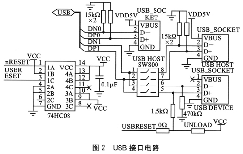 在ARM9開(kāi)發(fā)板內(nèi)部含有1個(gè)USB2.O接口控制器,接口電路如圖2所示。共有3個(gè)LISB接口(2個(gè)Host和1個(gè)Device),通過(guò)選擇開(kāi)關(guān)SW800進(jìn)行選通控制。74HC08作為4個(gè)二輸入與門邏輯電路,負(fù)責(zé)控制信號(hào)的邏輯組合。該接口用來(lái)連接USB接口的外部設(shè)備。
