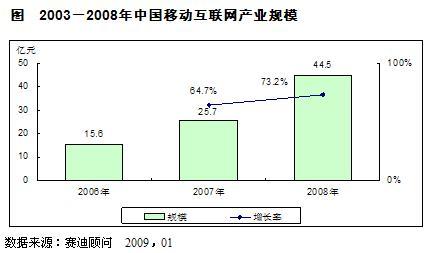 2008年中國移動(dòng)互聯(lián)網(wǎng)產(chǎn)業(yè)以73.2%的高速增長(zhǎng),實(shí)現(xiàn)了44.5億元的收入規(guī)模。