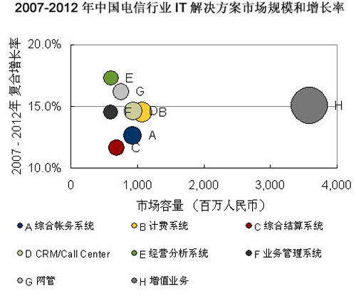 巨大的電信市場蛋糕給產(chǎn)業(yè)鏈的各級廠商都帶來良好的發(fā)展機(jī)遇,而其運(yùn)營支撐系統(tǒng)市場無疑將是增長最快的一部分。據(jù)市場調(diào)查機(jī)構(gòu)IDC預(yù)計(jì),2007年-2012年電信行業(yè)將注重運(yùn)營支撐系統(tǒng)的全業(yè)務(wù)運(yùn)營整合和支持前端業(yè)務(wù),因此3G增值業(yè)務(wù)、經(jīng)營分析系統(tǒng)、客戶關(guān)系管理系統(tǒng)、IT服務(wù)管理系統(tǒng)等建設(shè)將實(shí)現(xiàn)快速增長。運(yùn)營商的已有項(xiàng)目仍然會(huì)持續(xù)升級維護(hù),以及配合全業(yè)務(wù)運(yùn)營作出功能上的提升。IDC預(yù)計(jì),2012年電信行業(yè)IT解決方案整體市場規(guī)模將達(dá)到193.5億元人民幣。