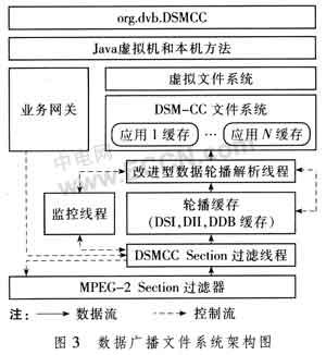 中間件的數(shù)據(jù)廣播文件系統(tǒng)主要負責裝載廣播應用,是數(shù)據(jù)輪播協(xié)議在終端實現(xiàn)的核心模塊。圖3給出了基于改進型數(shù)據(jù)輪播方案的數(shù)據(jù)廣播文件系統(tǒng)的架構圖。相關Java功能在org.dvb.DSMCC包實現(xiàn),對應中間件架構的系統(tǒng)層部分。具體的功能實現(xiàn)位于核心層。