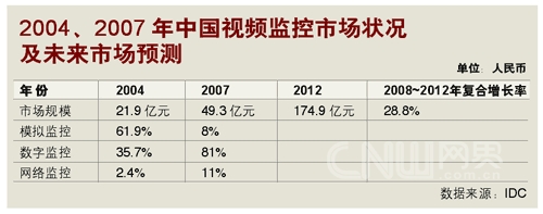 IDC的數(shù)字同樣樂(lè)觀(guān)。跟據(jù)IDC在2008年的預(yù)測(cè),2008~2012年,中國(guó)視頻監(jiān)控市場(chǎng)的年均復(fù)合增長(zhǎng)率將達(dá)28.8%,遠(yuǎn)高于IT市場(chǎng)投入的平均增長(zhǎng)率。而在模擬、數(shù)字與IP模式(即網(wǎng)絡(luò)監(jiān)控)組成的視頻監(jiān)控市場(chǎng)里,IP的增長(zhǎng)率又將高于前二者,成為市場(chǎng)增長(zhǎng)的強(qiáng)勁動(dòng)力!保ㄗⅲ耗M監(jiān)控是指圖像信號(hào)在采集后,通過(guò)模擬信號(hào)傳輸?shù)姆忾]式視頻監(jiān)控系統(tǒng)模式;數(shù)字監(jiān)控是指圖像信號(hào)在采集后,經(jīng)過(guò)編碼轉(zhuǎn)化成數(shù)字信號(hào)再進(jìn)行傳輸?shù)姆忾]或半封閉式視頻監(jiān)控系統(tǒng)模式;網(wǎng)絡(luò)監(jiān)控是指系統(tǒng)建立在以網(wǎng)絡(luò)為基礎(chǔ)的傳輸平臺(tái)的開(kāi)放式視頻監(jiān)控系統(tǒng)模式)。