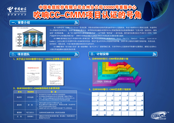 在為期四天(2009.1.13—2009.1.16)的最終評審中,專家們采用現場觀察、員工座談、文件審閱等多種形式對臺州電信10000號客服中心的運營現狀進行全方位考評,高度評價了客服中心在短短三個月中取得的進步。最終,認證專家一致通過授予臺州電信10000號呼叫中心能力成熟度模型CC-CMM應用級認證。