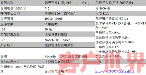 中國電信臺州市的10000客服中心,擁有100多名員工,承擔該市電信公司對外的所有客戶服務工作。中心先后被浙江省電信工會授予“先進女職工集體”,浙江省電信分公司授予“學習型示范班組”、“創(chuàng)建學習型組織先進班組(團隊)”,并獲得了“集團公司優(yōu)秀10000號服務團隊”,同時被中華全國總工會、信息產業(yè)部、共青團中央授予“全國先進女職工集體”以及“全國青年文明號”的稱號,連續(xù)兩年被信息產業(yè)部評定為“全國用戶滿意電信服務明星班組”。