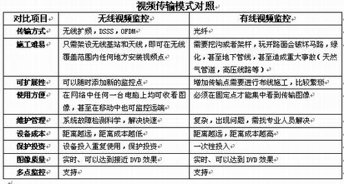 伴隨著社會經濟和信息化技術的飛速發(fā)展,視頻監(jiān)控應用在社會安全的各個行業(yè),平安城市、安全生產、森林防火、公園景區(qū)、公路交通等圍繞在人們日常生活和工作周圍的眾多應用都已經離不開視頻監(jiān)控。隨著和諧社會的理念深入到社會的每一個角落,視頻監(jiān)控仍將繼續(xù)上演前所未有的旺盛需求!無線有線對比表