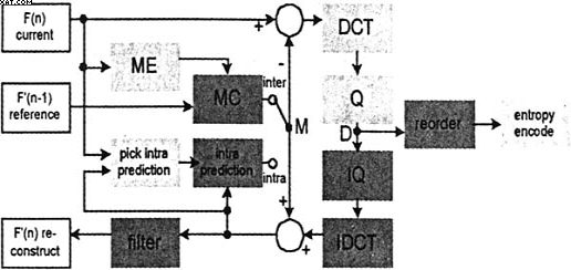 在前向通路(DCT到Q)中,每個(gè)MB可以以內(nèi)模式或交互模式編碼。在內(nèi)模式中,靠ME模塊在先編碼中求得參考MB。在交互模式中,從現(xiàn)在幀采樣中形成M。