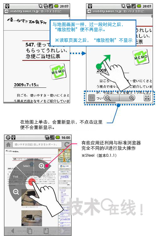 圖片說明: 利用不同操作調(diào)出同一工具為在Android的標(biāo)準(zhǔn)瀏覽器(上面的兩個畫面)上調(diào)出縮放畫面顯示的工具(縮放控制),用手指拖拽畫面(向一個方面滑動)。為利用地圖應(yīng)用軟件調(diào)出同一工具,需要輕敲畫面(敲擊)能從在Android市場上下載的瀏覽器(下面的畫面)有能夠利用完全不同的UI縮放畫面的工具。