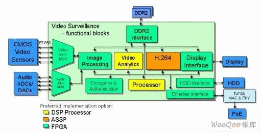 經(jīng)過壓縮后的數(shù)據(jù)通過硬盤驅(qū)動(dòng)器接口存儲(chǔ)至視頻存儲(chǔ)服務(wù)器,或通過以太網(wǎng)網(wǎng)絡(luò)發(fā)送。視頻數(shù)據(jù)傳送到顯示器之前通常是取自硬盤驅(qū)動(dòng)器,并經(jīng)過了解碼以及一些圖像后處理,如縮放、色彩空間轉(zhuǎn)換或覆蓋應(yīng)用。通常情況下,存儲(chǔ)器接口(如DDR2)是用來存儲(chǔ)視頻幀。此外,某些系統(tǒng)要求視頻內(nèi)容的實(shí)時(shí)加密以確保安全和源/用戶身份驗(yàn)證。最后,需要用處理器控制和協(xié)調(diào)/排定各種不同的任務(wù)。
