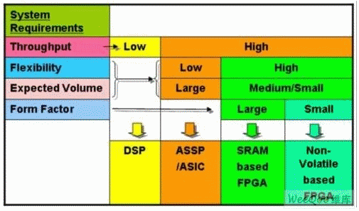 但是ASIC和ASSP帶來了高昂的非重復(fù)性工程費(fèi)用成本,除非批量非常大。如果只有一小部分用戶使用特殊的功能模塊,那么FPGA解決方案可提供更好的回報(bào)。對(duì)于ASIC和ASSP,這些器件有限的功能和固有的不靈活性,不允許在設(shè)計(jì)完成后根據(jù)市場(chǎng)的要求改進(jìn)或添加新的功能。FPGA卻能提供廣泛的功能和高度的靈活性。