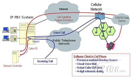 Sprint-Nextel最近推出了一種運(yùn)用Femtocells技術(shù)、類似cFMC的解決方案,稱為Airave。按照這個方案,用戶把蜂窩通信網(wǎng)絡(luò)的一個小型基站同基地的寬帶互聯(lián)網(wǎng)連接在一起。如圖1所示,這兩種方案都是利用寬帶互聯(lián)網(wǎng)和蜂窩通信網(wǎng)絡(luò)其中之一實現(xiàn)Voip,不同的區(qū)別只是本地的無線連接是運(yùn)用Wi-Fi技術(shù)還是蜂窩通信網(wǎng)絡(luò)。對企業(yè)用戶而言,主要缺點(diǎn)是,這兩種實現(xiàn)方式提供的都是由用戶主導(dǎo)的單一語音服務(wù),而沒有面向企業(yè)PBX或移動UC系統(tǒng)的接口。