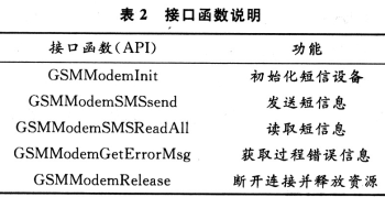 短信貓通過RS 232串口與計算機連接,系統(tǒng)需通過接口驅(qū)動短信貓發(fā)送或讀取短信,各接口函數(shù)說明見表2。