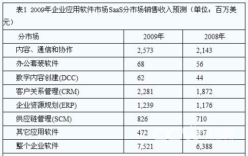 在Gartner的統(tǒng)計(jì)中,SaaS領(lǐng)域中,除了CRM之外,內(nèi)容、通訊和協(xié)作市場同樣表現(xiàn)不俗,在2009年,這一市場的銷售收入將從2008年的21.4億美元增長到26億美元,甚至超過了CRM分市場的23億美元。其他如ERP分市場等同樣占據(jù)不小的份額。