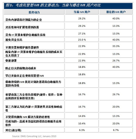 圖3顯示了現(xiàn)有和潛在的語音自助服務(wù)用戶尋求托管型IVR的主要動力來源。潛在客戶認(rèn)真考慮托管型IVR解決方案的兩個很明顯的原因是避免大的資金開銷和最小化啟動成本,在經(jīng)濟(jì)不景氣時這樣的做法并不令人意外。另外還有個原因是希望一邊使用該方案一邊積累經(jīng)驗和知識。
