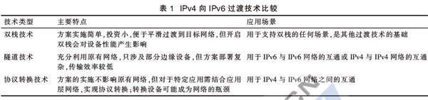 每種過(guò)渡技術(shù)都有一定的適用場(chǎng)景,過(guò)渡技術(shù)的選擇,不僅要關(guān)注過(guò)渡過(guò)程對(duì)用戶體驗(yàn)的影響,還應(yīng)考慮網(wǎng)絡(luò)、終端和平臺(tái)的改造成本以及技術(shù)演進(jìn)的復(fù)雜性。從表1可以看出,作為其他過(guò)渡技術(shù)的基礎(chǔ),雙棧技術(shù)是實(shí)現(xiàn)IPv6節(jié)點(diǎn)與IPv4節(jié)點(diǎn)兼容的最直接方式,因此,在三網(wǎng)融合環(huán)境下,應(yīng)遵照雙棧技術(shù)為主和其他過(guò)渡技術(shù)為輔的原則,針對(duì)不同企業(yè)的網(wǎng)絡(luò)及業(yè)務(wù)現(xiàn)狀,靈活調(diào)整策略,實(shí)現(xiàn)IPv6的引入。