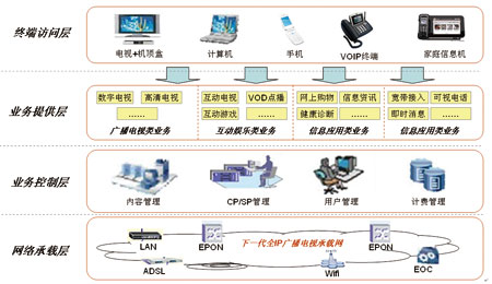 目前用戶是通過電視+機頂盒的方式享受廣電運營商提供的數字電視服務,而未來用戶可通過計算機、手機、VOIP終端、家庭信息機等多樣化的終端訪問廣電運營商所提供的寬帶接入服務、VOIP的語音服務、各種信息化應用服務。