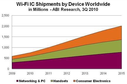 Wi-Fi技術現(xiàn)已被用于幾乎所有筆記本和上網(wǎng)本、智能電話和游戲設備。電話、音頻播放器、打印機、機頂盒以及其他消費類電子設備對Wi-Fi技術的采用率也在不斷增加,來自Wi-Fi聯(lián)盟和多家調(diào)研機構的數(shù)據(jù)印證了這種市場增長趨勢。2009年,僅在中國銷售的具備Wi-Fi功能的筆記本電腦就達到800萬臺,全球Wi-Fi設備認證數(shù)量則增加了約50%,消費類電子設備和電話數(shù)量增加了100%以上。截止到2010年7月,消費類電子設施與電話類產(chǎn)品的認證數(shù)量已經(jīng)超過了2009年全年數(shù)量,預計全年售出約8億臺Wi-Fi設備。電子工程專輯