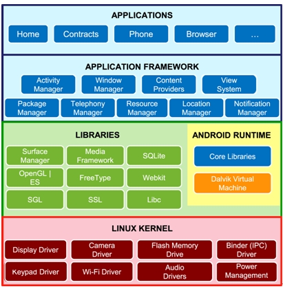 Android執(zhí)行環(huán)境(Android Runtime):透過(guò)Core Libraries(核心函式庫(kù))以及暫存器型態(tài)的Dalvik Virtual Machine(Dalvik虛擬機(jī)器)來(lái)執(zhí)行程序。