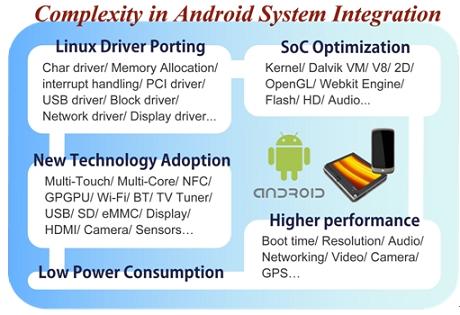 對(duì)廠商而言,開發(fā)一款A(yù)ndroid設(shè)備,不僅僅只是將所有零組件組合成為一個(gè)產(chǎn)品那么容易,最大的學(xué)問便在于將系統(tǒng)單芯片(System-on-a-chip,SoC)、各種新技術(shù)和Android系統(tǒng)進(jìn)行整合,SoC涉及像是Dalvik Virtual Machine、OpenGL、V8、Webkit Engine等上層的演算,與Android間的結(jié)合便必須透過(guò)不斷的嘗試與驗(yàn)證,才能研發(fā)出既符合成本效益、又有良好效能的優(yōu)化產(chǎn)品。目前市面上有些SoC廠商已針對(duì)Android系統(tǒng)的特性,提供整合過(guò)的SoC平臺(tái),將藍(lán)牙、相機(jī)或上網(wǎng)等常用功能模組預(yù)先寫入,減少終端成品廠商費(fèi)力整合開發(fā)的時(shí)間,但對(duì)廠商而言,這樣的預(yù)先整合是否適合自身產(chǎn)品,以及是否需要再作更細(xì)致的修改,則又是更困難的課題。