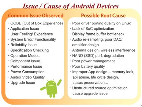 盡管Android系統(tǒng)的普及看似指日可待,但在實(shí)際的產(chǎn)品應(yīng)用上,也有其可能產(chǎn)生的問題風(fēng)險(xiǎn)。Android作為一個(gè)開放式的操作系統(tǒng),是Google提供廠商的操作系統(tǒng)參考架構(gòu)(reference design),廠商能有充足的發(fā)揮空間,以Android為基礎(chǔ)向上開發(fā)設(shè)計(jì)自家產(chǎn)品,但也因?yàn)檫@樣的開放性與自由性,讓廠商在軟硬件結(jié)合的這個(gè)環(huán)節(jié)必須下更大的功夫,像是如何挑選合適的硬件包括基頻處理器、通信芯片、觸控感應(yīng)芯片、天線與存儲(chǔ)器模組等,以及如何調(diào)整出最適當(dāng)?shù)能浖O(shè)定等,更重要的是如何將軟硬件整合,開發(fā)出差異化的產(chǎn)品。這中間所有的細(xì)節(jié)都會(huì)對(duì)產(chǎn)品最終樣貌產(chǎn)生莫大的影響,像是其功能的完整度、使用接口的設(shè)計(jì)、效能表現(xiàn)(例如觸控滑動(dòng)畫面、開啟程序所需時(shí)間)、品質(zhì)可靠度、甚至是后續(xù)的固件升級(jí)動(dòng)作等等。在此百佳泰便試圖以專業(yè)中立的測(cè)試實(shí)驗(yàn)室角度,來(lái)點(diǎn)出廠商應(yīng)用Android于手機(jī)、平板電腦或其他設(shè)備時(shí)應(yīng)注意的開發(fā)重點(diǎn),以希冀作為一個(gè)有效的參考資訊。