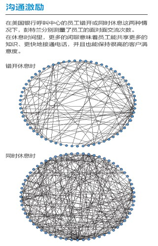 去年,彭特蘭的實(shí)驗(yàn)室與美國(guó)銀行(Bank of America)設(shè)在羅得島(Rhode Island)的呼叫中心合作,在80 名中心員工身上安裝了社會(huì)傳感器。這種傳感器看起來(lái)像一枚不顯眼的徽章,使用藍(lán)牙和紅外信號(hào)監(jiān)測(cè)實(shí)驗(yàn)對(duì)象每分鐘與哪些同事交談。測(cè)試活動(dòng)先開(kāi)展了一個(gè)月,后來(lái)又進(jìn)行了6周。第一個(gè)月后,實(shí)驗(yàn)室的研究人員發(fā)現(xiàn),與更多同事進(jìn)行過(guò)交談的員工能夠更快地接通電話,他們自我感覺(jué)的壓力也相對(duì)較小,而客戶滿意度卻與其他人一樣高。與刻板地遵循員工手冊(cè)或服從經(jīng)理的電子郵件指示相比,通過(guò)非正式的閑聊來(lái)交流問(wèn)題和解決方案似乎能取得更好的結(jié)果。有了這種結(jié)論之后,該呼叫中心嘗試盡量將員工的休息時(shí)間安排在一起,而非像過(guò)去那樣錯(cuò)開(kāi)。這樣員工就有了更多的時(shí)間參與閑聊。幾個(gè)月后,美國(guó)銀行向?qū)嶒?yàn)室報(bào)告了結(jié)果:該呼叫中心獲得了相當(dāng)于每年1,500 萬(wàn)美元的生產(chǎn)力提升。