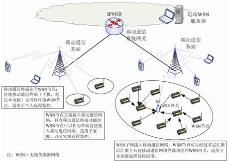 圖:無(wú)線傳感器網(wǎng)絡(luò)和移動(dòng)通信的結(jié)合
