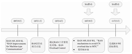 在2010年9月的RAN #49次全會(huì)上,在SA的推動(dòng)下,RAN全會(huì)決定成立一個(gè)關(guān)于MTC的新的WI,用來(lái)解決避免大量MTC設(shè)備接入導(dǎo)致的核心網(wǎng)過(guò)載問(wèn)題。2011年3月份,RAN2完成了此WI并在RAN全會(huì)上通過(guò)。圖4所示的是3GPP MTC R10標(biāo)準(zhǔn)化項(xiàng)目進(jìn)程情況。