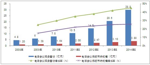圖表 4 2008-2014年中國電話會(huì)議市場規(guī)模及增長率