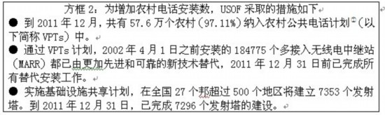農(nóng)村電話安裝數(shù)從2007年3月的4710萬增加到2011年3月的2億8229萬,2011年12月達(dá)到3億1539萬。農(nóng)村電話數(shù)占全國電話總數(shù)的比例也從2007年的22.88%增加到2011年12月的34.04%。移動(dòng)電話數(shù)量對農(nóng)村電話總數(shù)的增加貢獻(xiàn)很大。移動(dòng)電話在農(nóng)村電話總數(shù)中的比重從2007年3月的73.33%提高到2011年3月的96.90%,到2011年12月達(dá)到97.53%。2011-2012年(到12月)期間,農(nóng)村電話數(shù)量的增長率為11.73%,而城市電話用戶增長率則為8.35%。個(gè)人用戶是農(nóng)村電話數(shù)增加的主要推動(dòng)力,個(gè)人用戶占農(nóng)村電話總數(shù)的比重從2007年的51.87%上升到2011年2月的86.78%。為了增加農(nóng)村電話安裝總數(shù),USOF采取了以下措施,請見方框2所示。