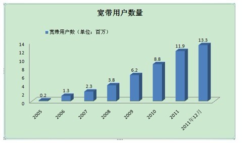 去年進(jìn)行的3G/BWA牌照拍賣有望成為一個(gè)催化劑,將寬帶接入擴(kuò)展到印度最偏遠(yuǎn)的地方。印度電信市場正在經(jīng)歷“信息革命”。為了促進(jìn)寬帶的普及,政府已經(jīng)公布并實(shí)施了多項(xiàng)政策(見方框3)。得益于這些政策的實(shí)施,寬帶用戶數(shù)從2005年的18萬增加到2011年3月的1187萬,2011年底達(dá)到1330萬。