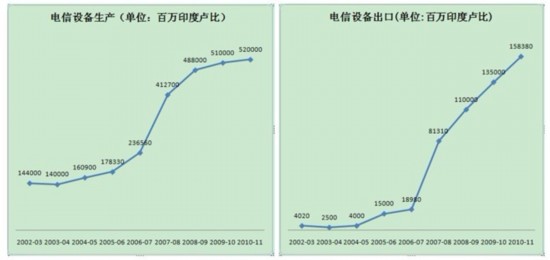 印度并不滿足于僅成為制造業(yè)中心,還計(jì)劃擴(kuò)大出口。2006-2007年,印度電信設(shè)備出口總價(jià)值約為189.8億盧比,到2010-2011年,這一數(shù)字增加到1583.8億,增長了730%。