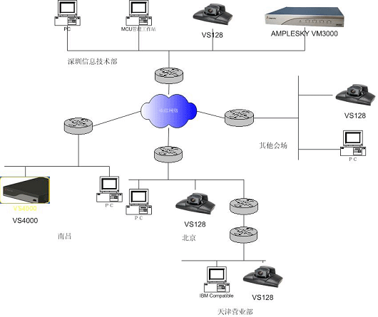 江南證券有限責(zé)任公司骨干帶寬為512K,由于IP損耗,真正能建立的會議帶寬為384K。由于為本次視頻會議系統(tǒng)配置的Amplesky公司的VM3000可支持8用戶512K會場,即使將來帶寬增加,需建立512K帶寬會議時也能滿足需要,無需再投資。當(dāng)會議規(guī)模需要擴大時,只需購買升級軟件,而無需再投資硬件設(shè)備,VM3000可擴展到支持36用戶。