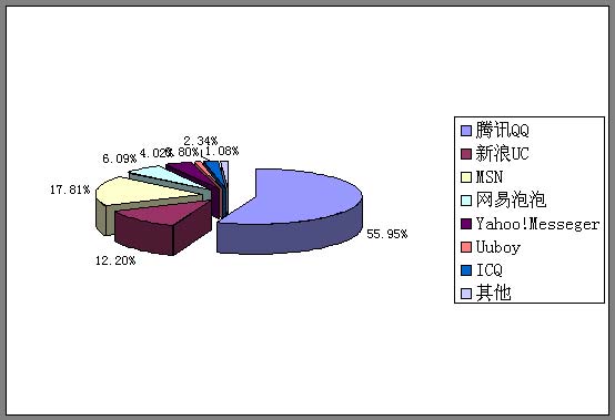 根據(jù)本次報(bào)告的“即時(shí)通信軟件使用情況分析”,新浪UC僅比排名第二的MSN相差5個(gè)百分點(diǎn),并以超過一倍的相當(dāng)優(yōu)勢超越排名第四、第五的其他IM軟件。至此,國內(nèi)IM領(lǐng)域已經(jīng)形成了以騰訊QQ、微軟MSN、新浪UC三大巨頭“瓜分天下”的格局,三者之和牢牢掌控了國內(nèi)IM領(lǐng)域?qū)⒔?6%以上的市場份額(圖二)。