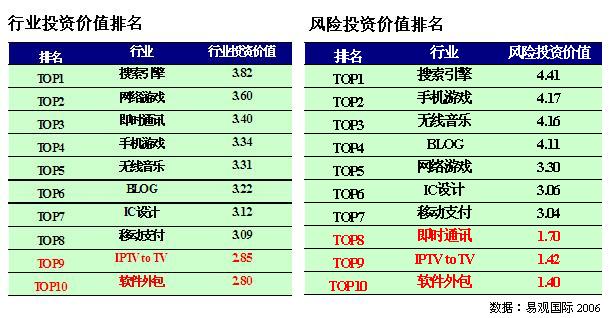 設(shè)計行業(yè)將成為半導(dǎo)體行業(yè)風(fēng)險投資追逐的新星并具有相當?shù)拈L期行業(yè)投資價值。在十個行業(yè)中,IPTV 和軟件外包行業(yè)三年內(nèi)的投資價值最低。